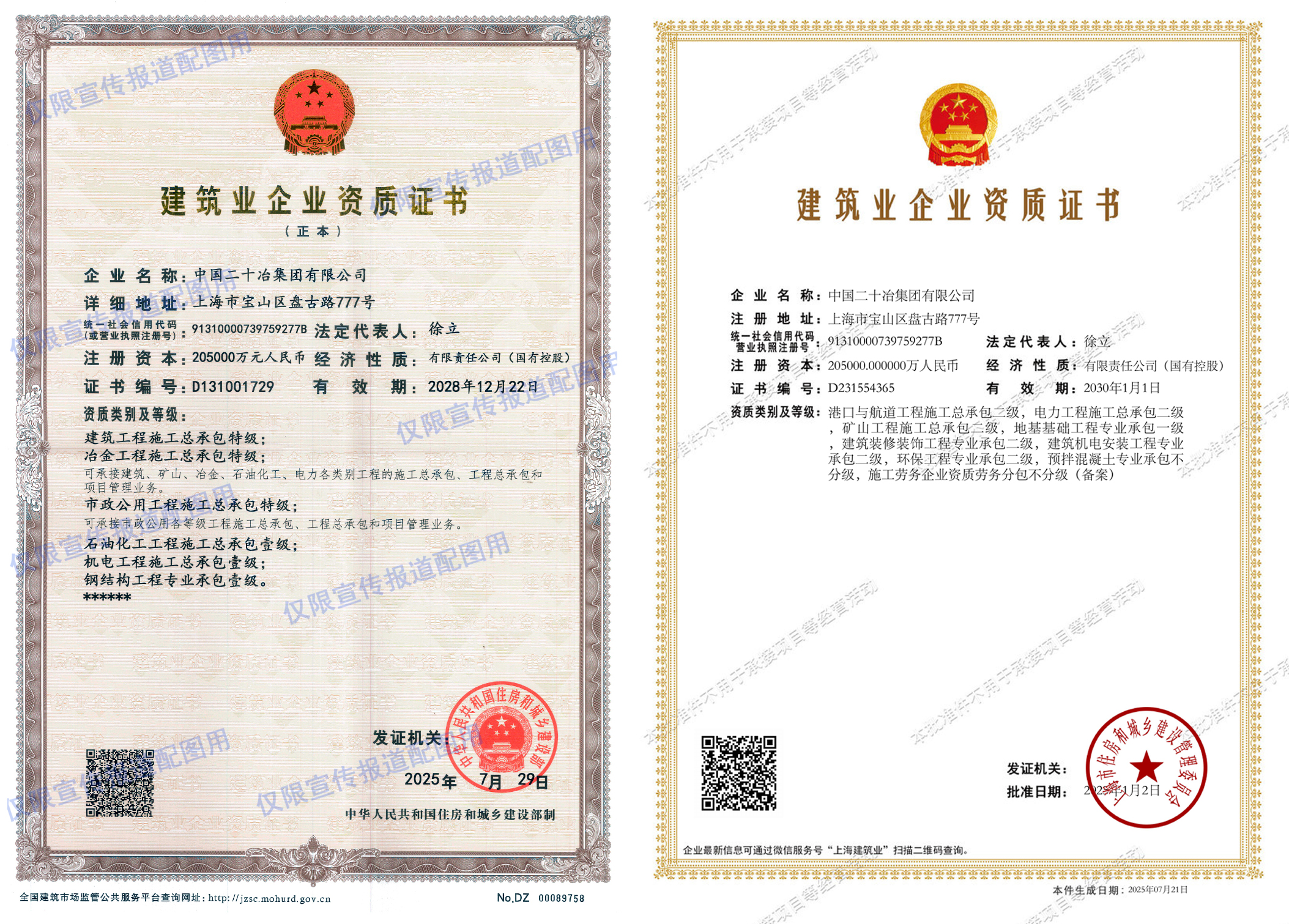 7月31日,住建部發布《關于核準2025年度第八批建設工程企業資質延續名單的公告》,中國二十冶石油化工工程施工總承包一級、機電工程施工總承包一級、鋼結構工程專業承包一級等三項部批資質,順利通過住建部資質延續審查。