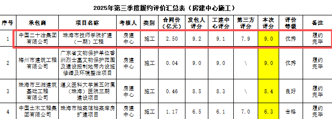 10月24日,在珠海市房建中心公布的第三季度履約評價結果中,由廣東二十冶承建的珠海市技師學院擴建(一期)項目憑借卓越的工程品質與高效的履約能力,榮獲“優秀”等級評價。