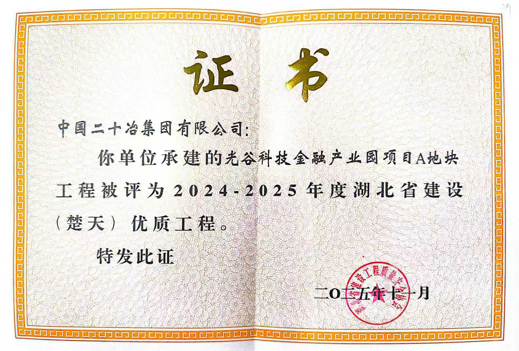 11月18日,湖北二十冶承建的武漢光谷科技金融產業園項目A地塊獲評湖北省2025年度“楚天杯”優質工程獎。